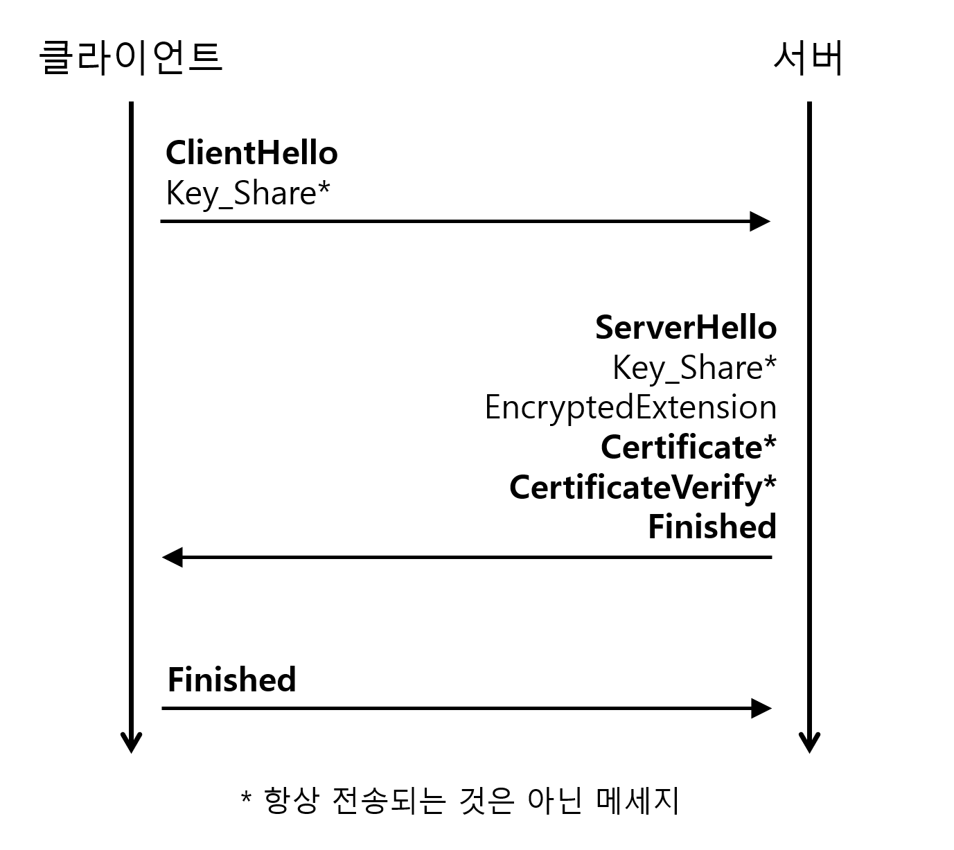 또 서버는 Certificate 메세지와 CertificateVerify 메세지를 전송한다. 이는 각각 인증서와 검증을 위한 디지털 서명을 의미한다. 클라이언트는 이 메세지를 토대로 서버의 공개 키를 검증하게 된다. 이어서 서버와 클라이언트는 TLS 핸드셰이크의 마지막을 의미하는 Finished 메세지를 주고받는다.